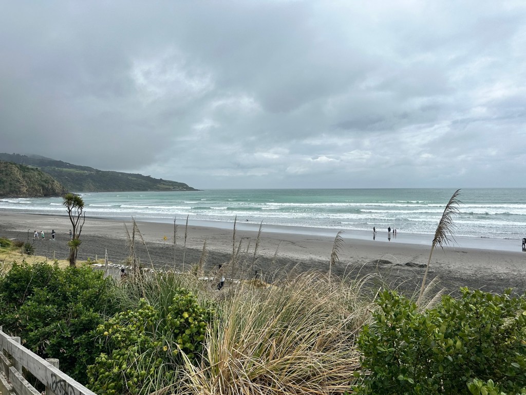Ok, it was straight-up raining when we got to the beach, we were all soaked and chilly – it felt very PNW-esk. But, what better time to jump in the Tasman Sea for the first time than when it’s raining! 🥰. Leif declined as politely as a 12-year-old can but Mason eventually jumped in a few waves with me as the sun started to break through the clouds.