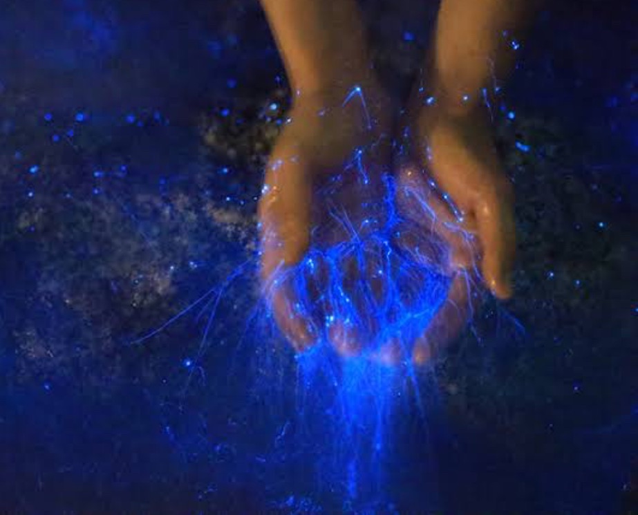 As I stepped in the water and felt the cool saline bliss draw me in deeper, tiny fireflies began to sparkle and swirl around my legs and waist. Swirling my hands in the water created a sudden magical riot of sea sparkles and glowing ripples. Pushing out into the depths, I was suddenly enveloped in the stars both above and all around me.