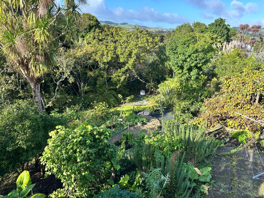 Then, muddy, exhausted and very happy, we drove out to Raglan for dinner and to stay the night. The dinner was fabulous and this is the back garden of the little Airbnb we stayed in.