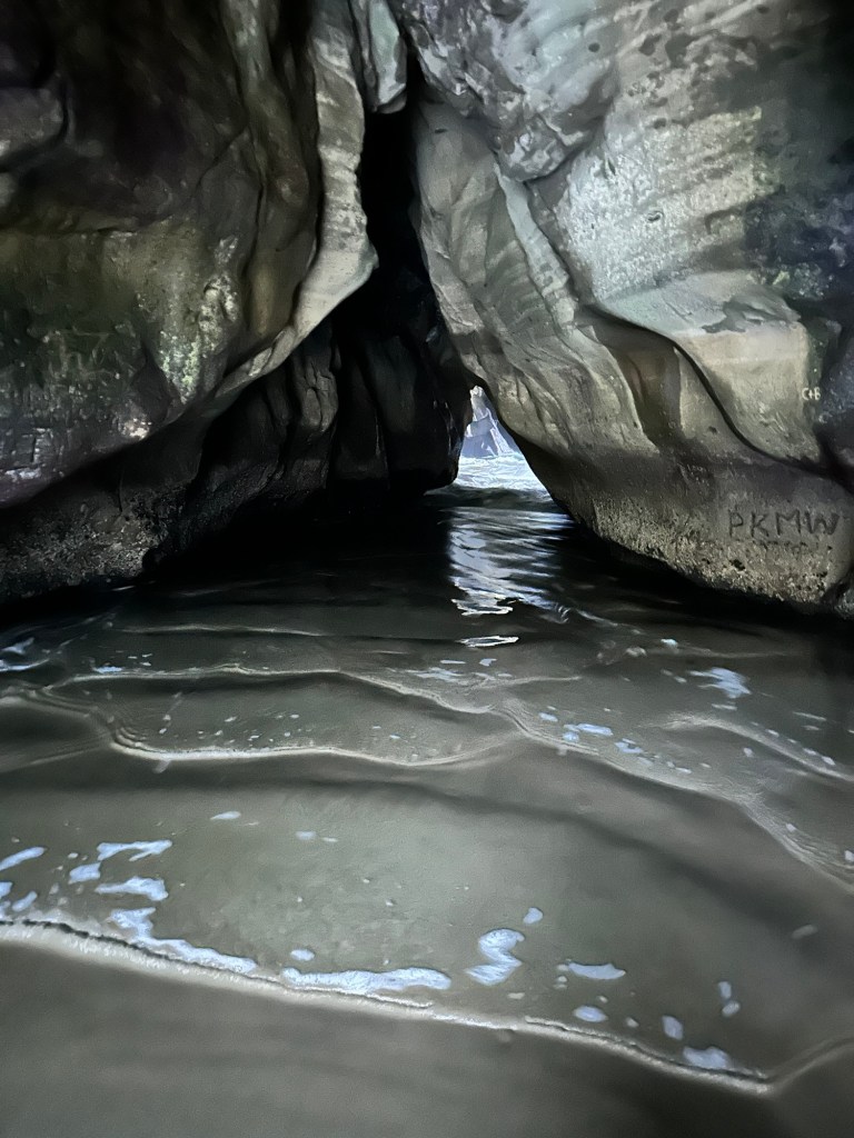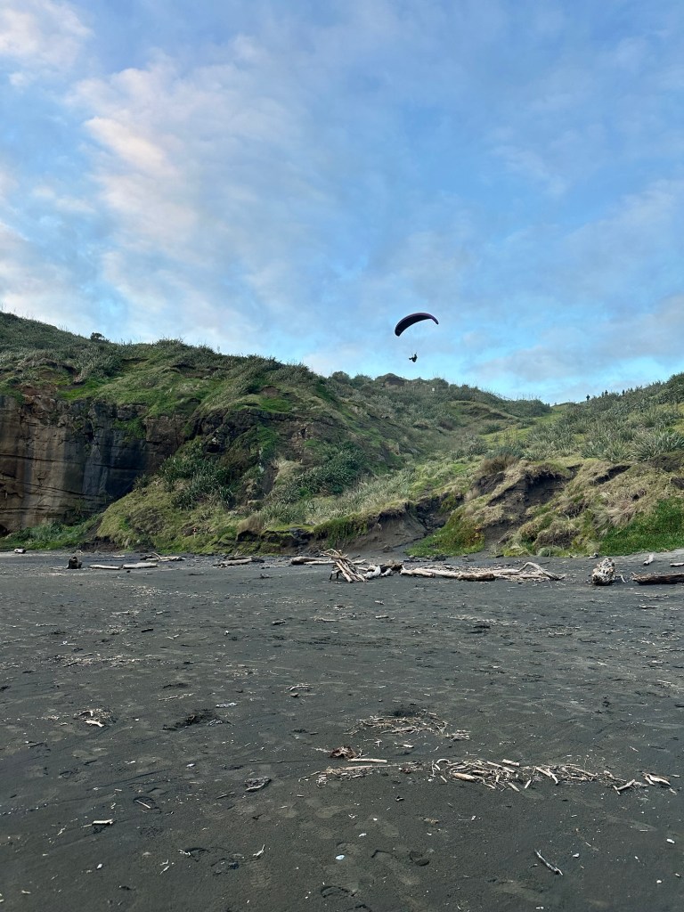 The black sand beach was stunning on the bay side of the beach cave, and there were paragliders practicing on the steady updrafts!